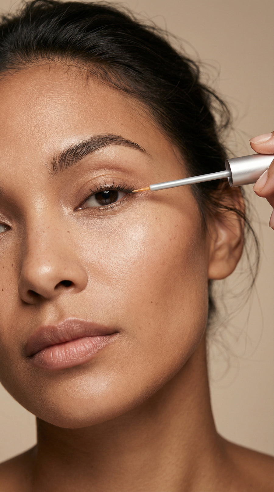2. Apply one stroke of the serum only to your upper lash line (like an eyeliner). One dip is sufficient for both eyes.